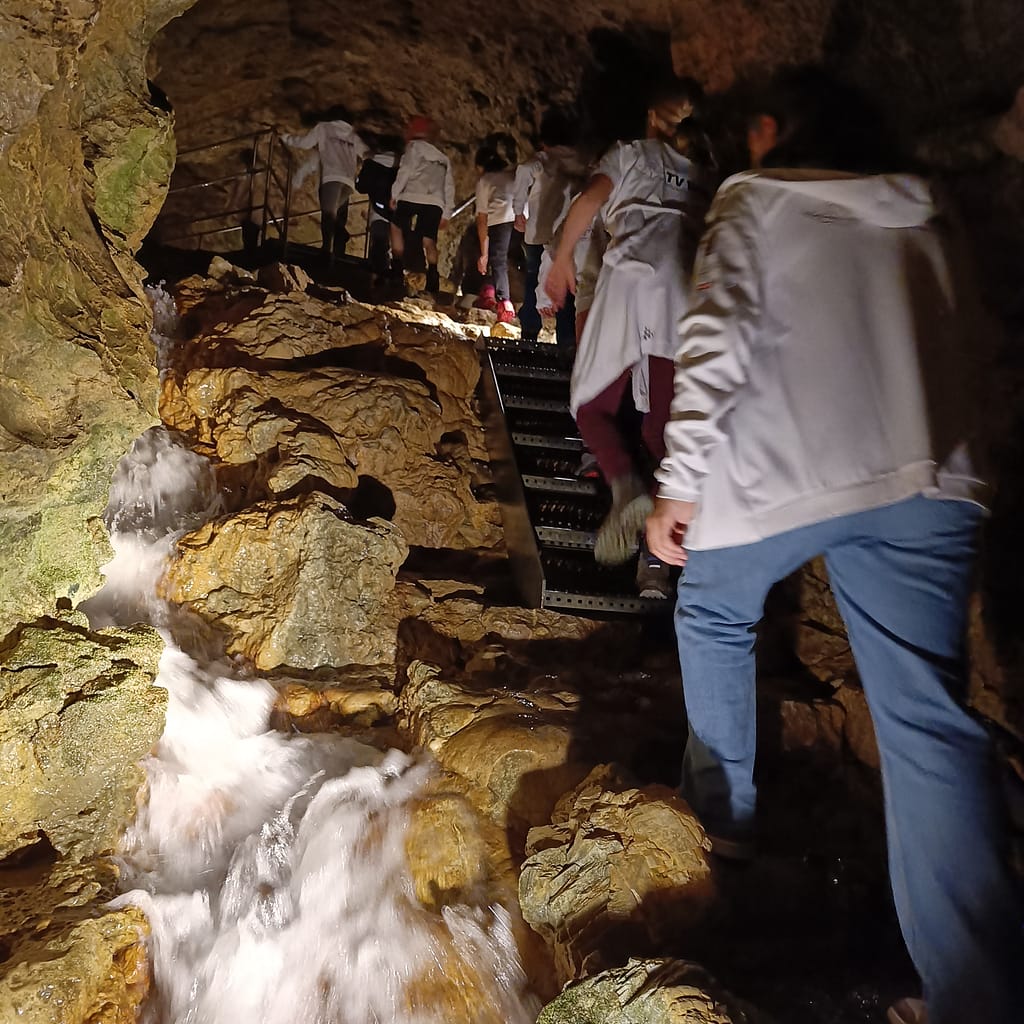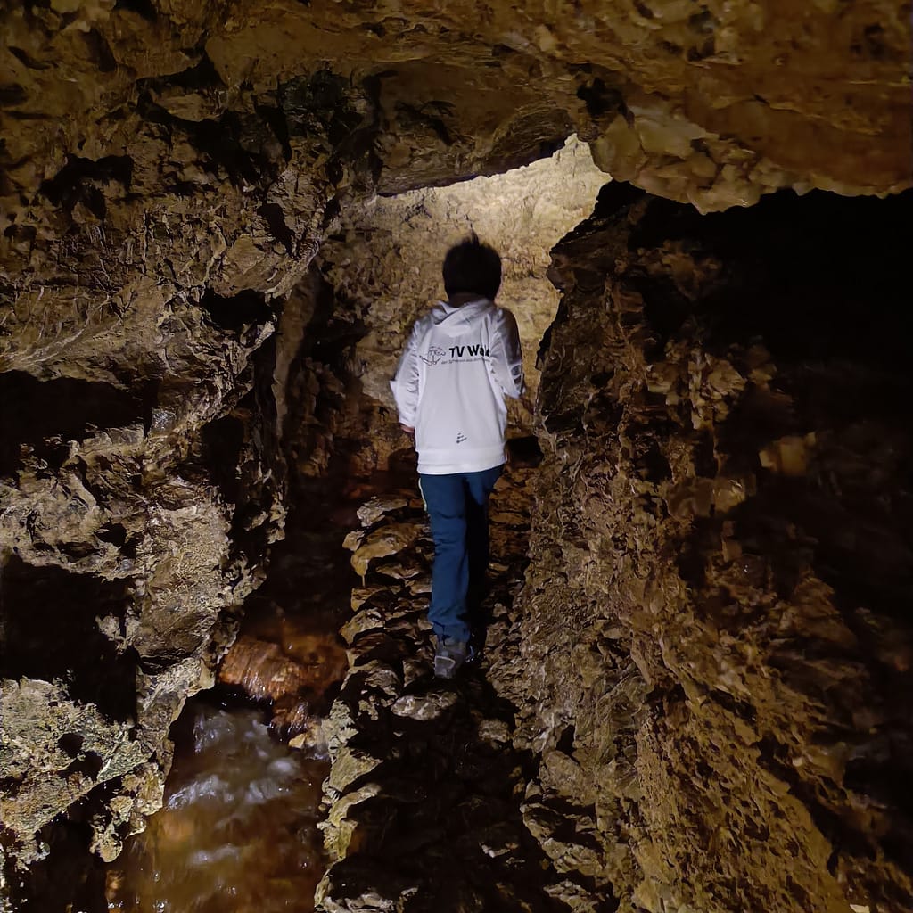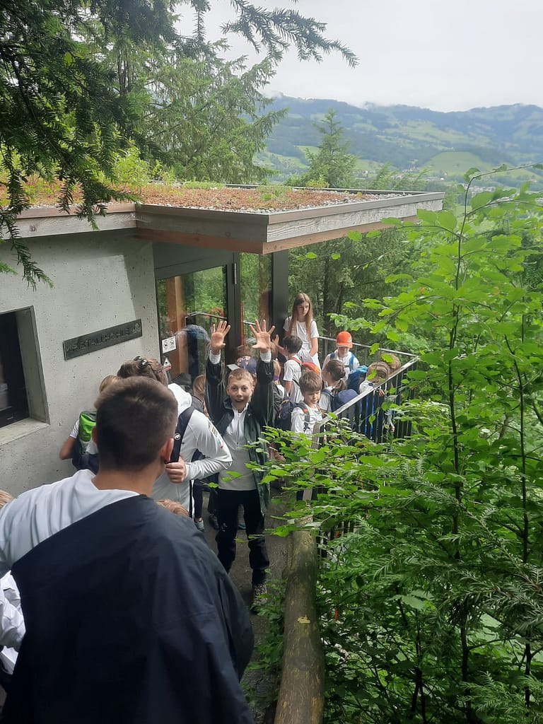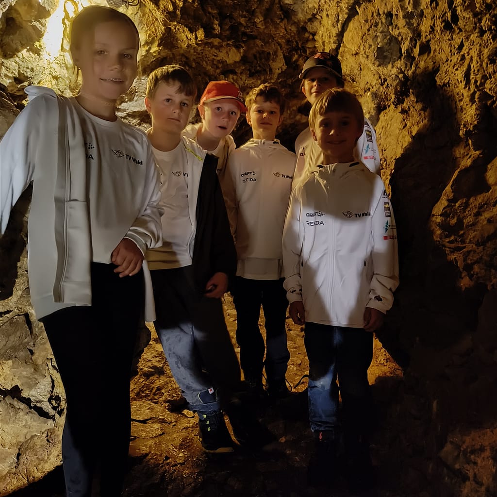 24 Kinder trafen sich um 9 Uhr auf dem Schulhausplatz. Mit Autos und einem Bus ging es nach Oberriet in den Kobelwald zur Kristallhöhle. Nach einem 30-minütigen Spaziergang betraten die Kinder in zwei Gruppen die beeindruckende Unterwelt. In der Höhle hatten vor allem die Kleinen einen Vorteil. Nicht wenige Male mussten wir uns ducken oder über einen kleinen Wasserfall klettern.